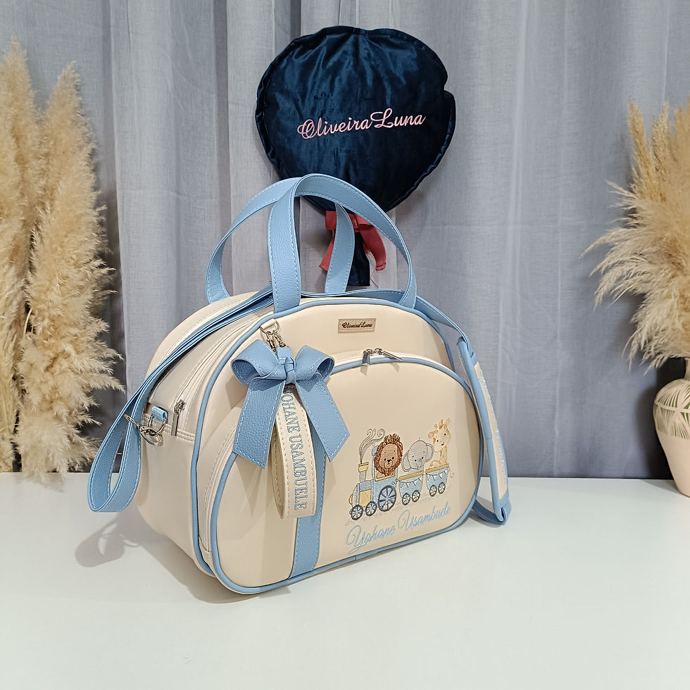 Mala Maternidade bege e azul bebé, personalizado com nome de seu bebé.